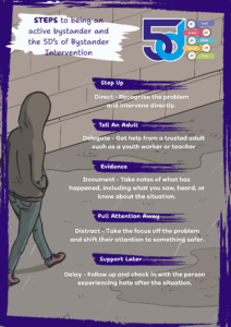 This resource is intended to help young people intervene in situations where someone is the target of hate behaviour. It introduces our approach to being an Active Bystander.